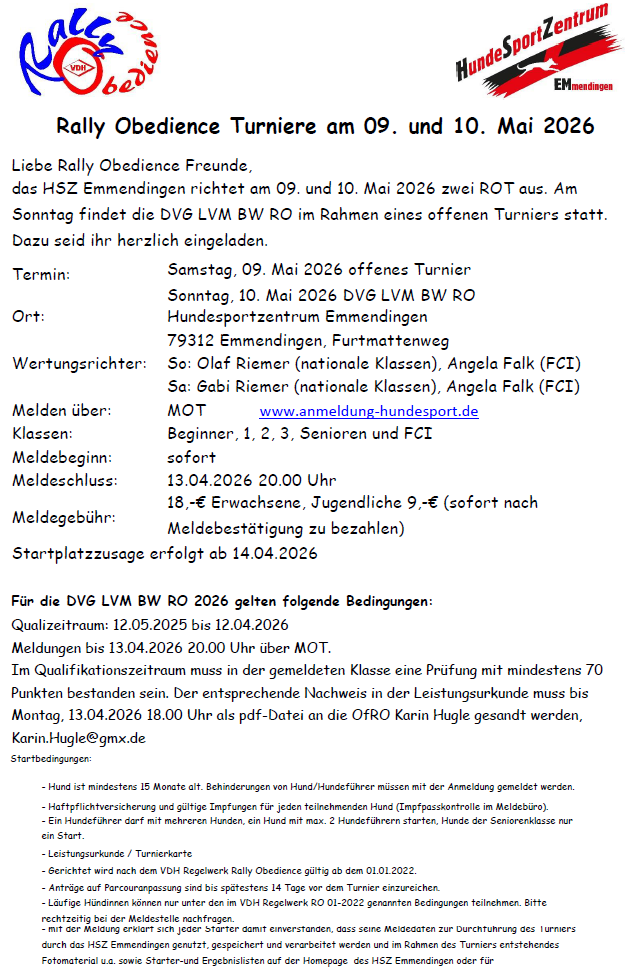 Rally Obedience Turniere am 09.+10. Mai 2026
